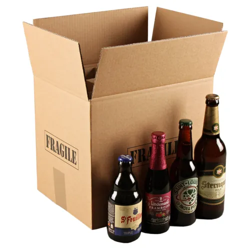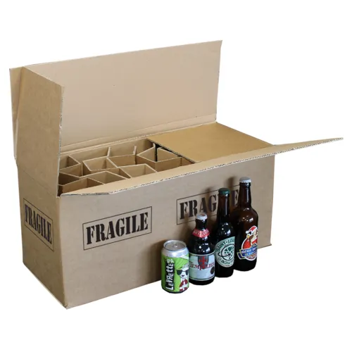 Carton d’expédition en double cannelure pour 6 – 12 ou 24 bières de type Long-Neck, Steinie, Canette… La mention « Fragile » est imprimé sur les 4 côtés du carton. Sécurité garantie avec sa double paroi intérieure et son calage approprié en double cannelure. Vos bouteilles seront ainsi protégées et bien séparées. Montage facile et rapide. Sur demande.